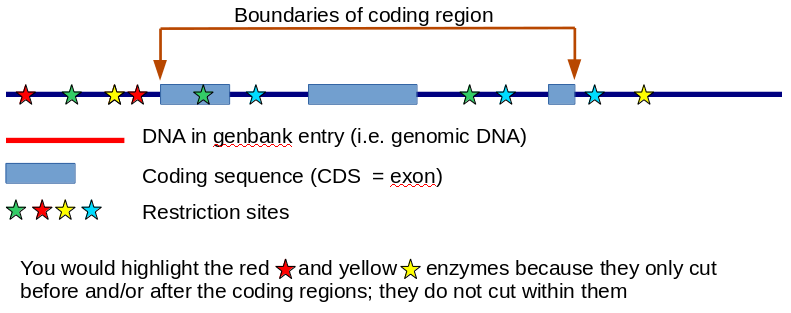 So the idea is simply to identify all the sites at which each restriction enzyme cuts. If a particular enzyme cuts before and/or after the coding regions, but not within the coding regions, then we highlight it in colour or whatever (maybe just with some text to say 'this is a good enzyme!') to say that this would be a useful enzyme to use for the genetic manipulation of this gene.